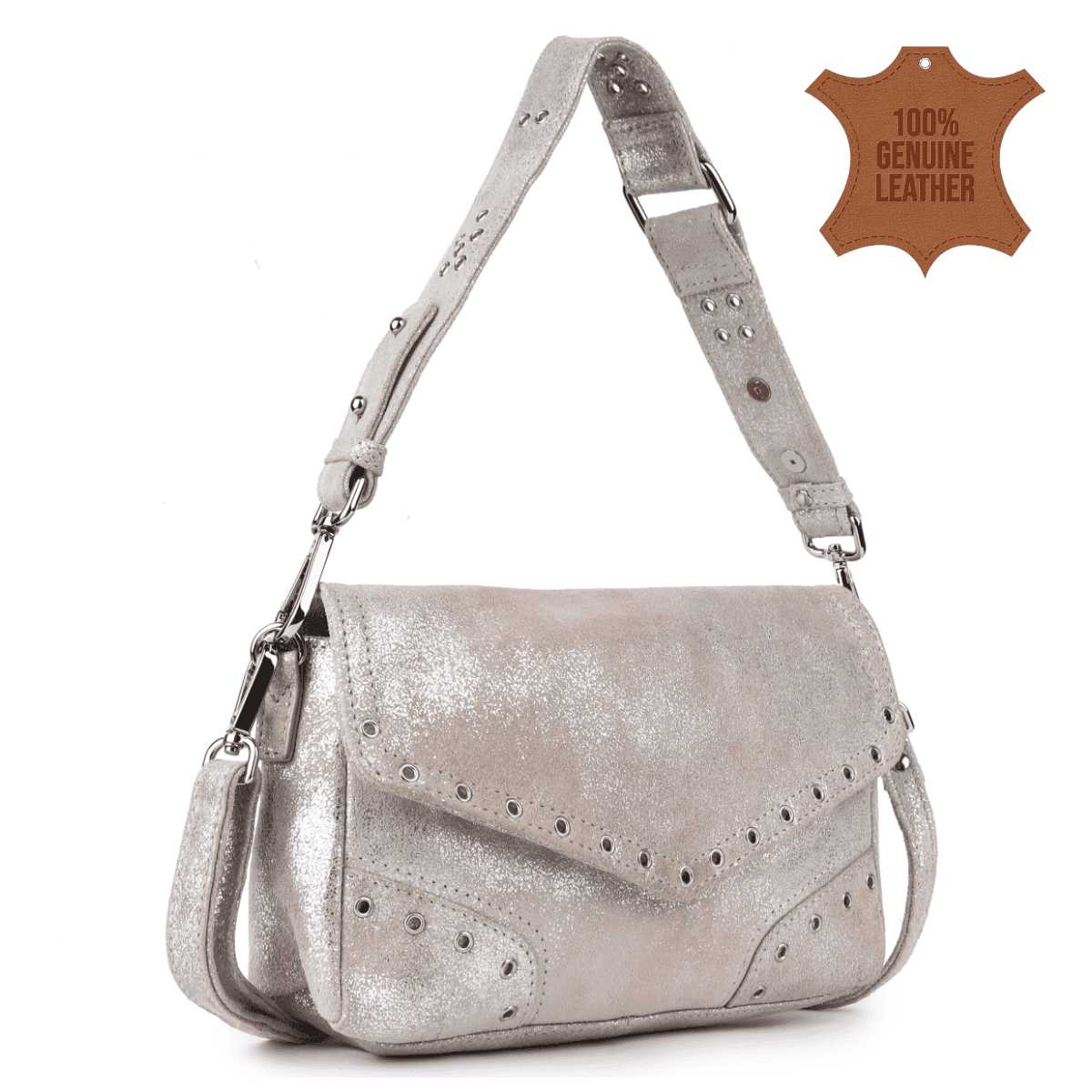 Elevate your wardrobe with the Silver Sandstone Studded Leather Sling Bag, a stylish statement piece designed for fashion-forward women who love blending shimmer with structure. Crafted from genuine suede leather with a distressed metallic silver finish, this bag delivers high-end flair without compromising on everyday functionality.